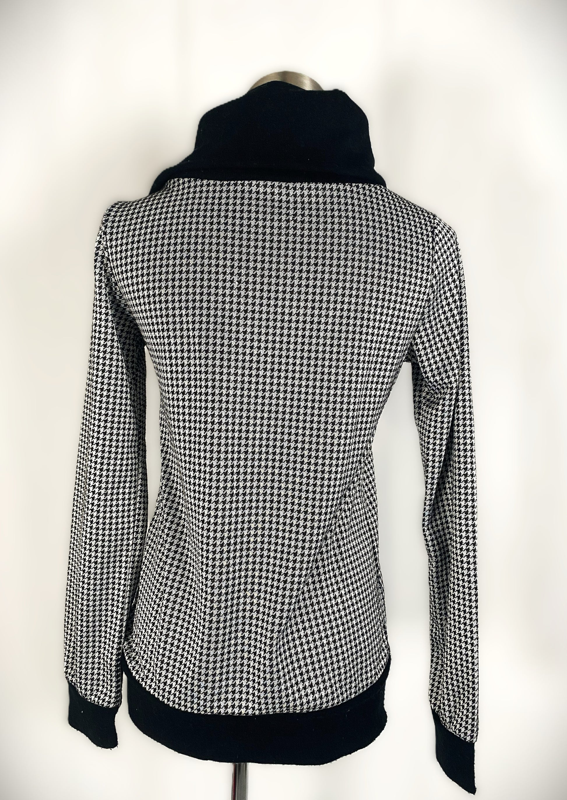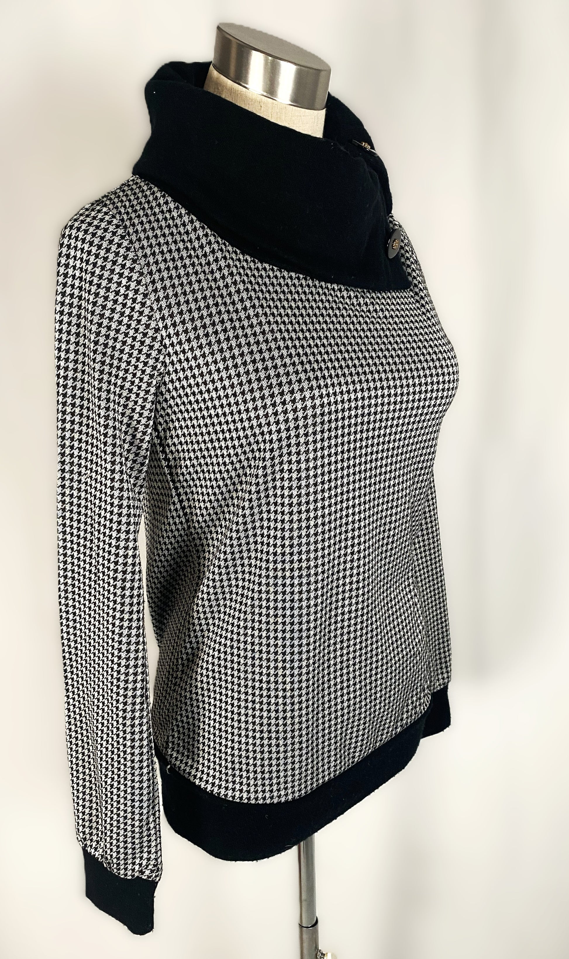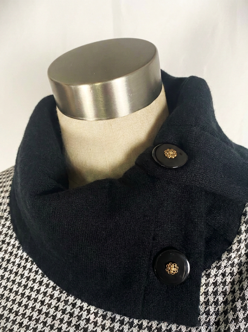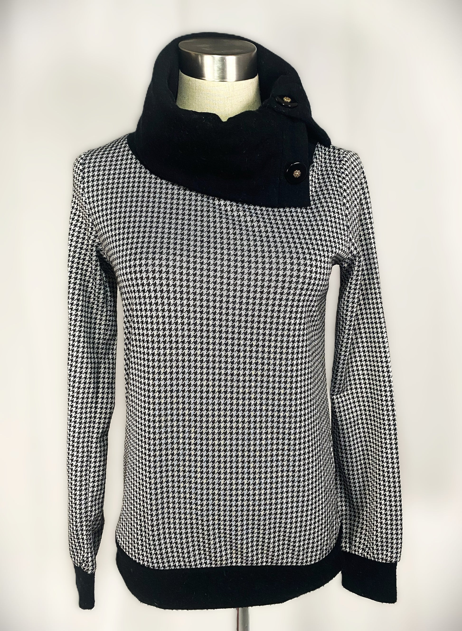 時代を超えた白黒の千鳥格子模様が特徴の洗練されたニットセーター。ビジネスシーンにもカジュアルシーンにも洗練された印象を与えます。特徴的なのは、しっかりとした厚手のカウルネック。ブラックとゴールドの装飾ボタンが2つあしらわれ、視覚的なアクセントになっています。