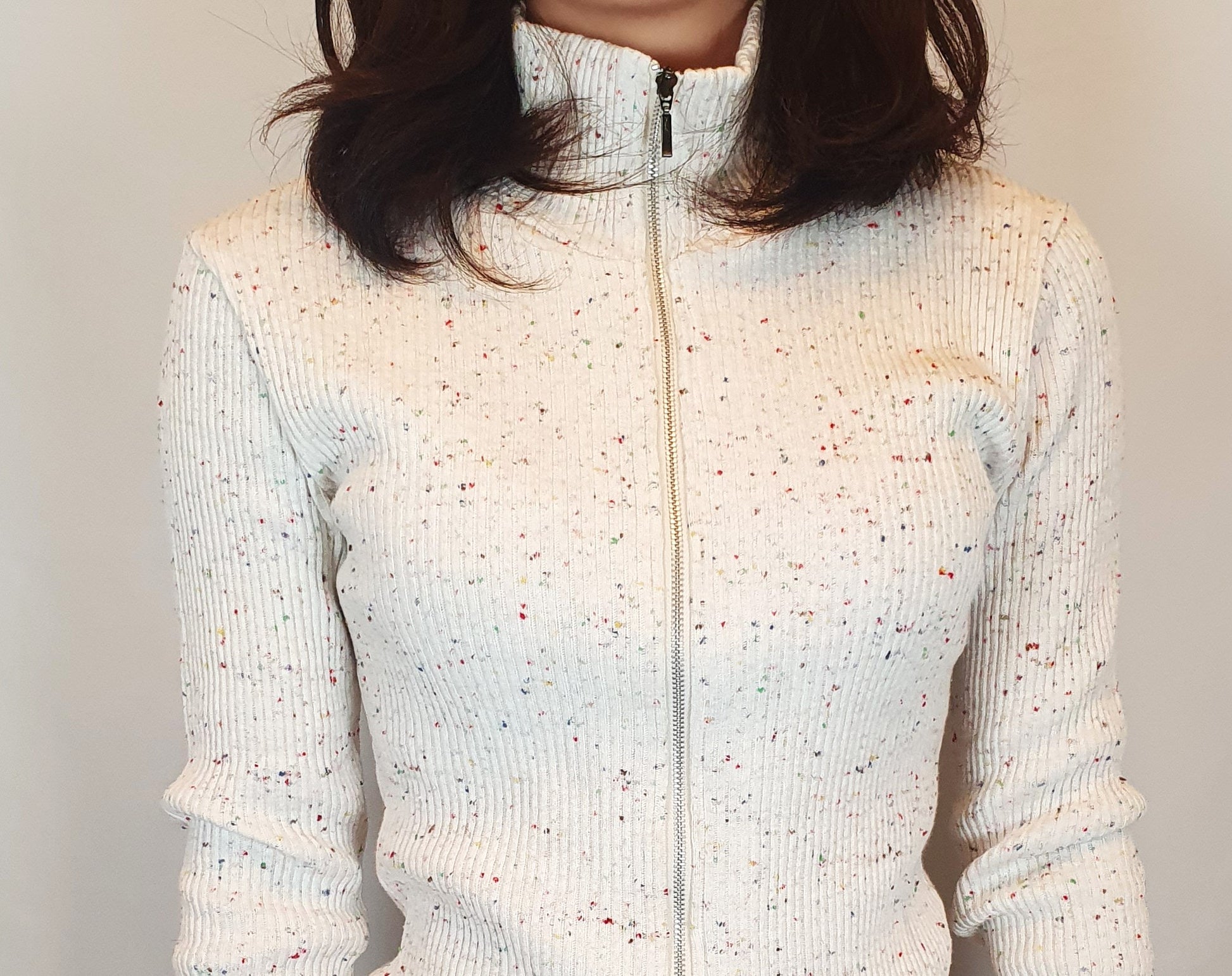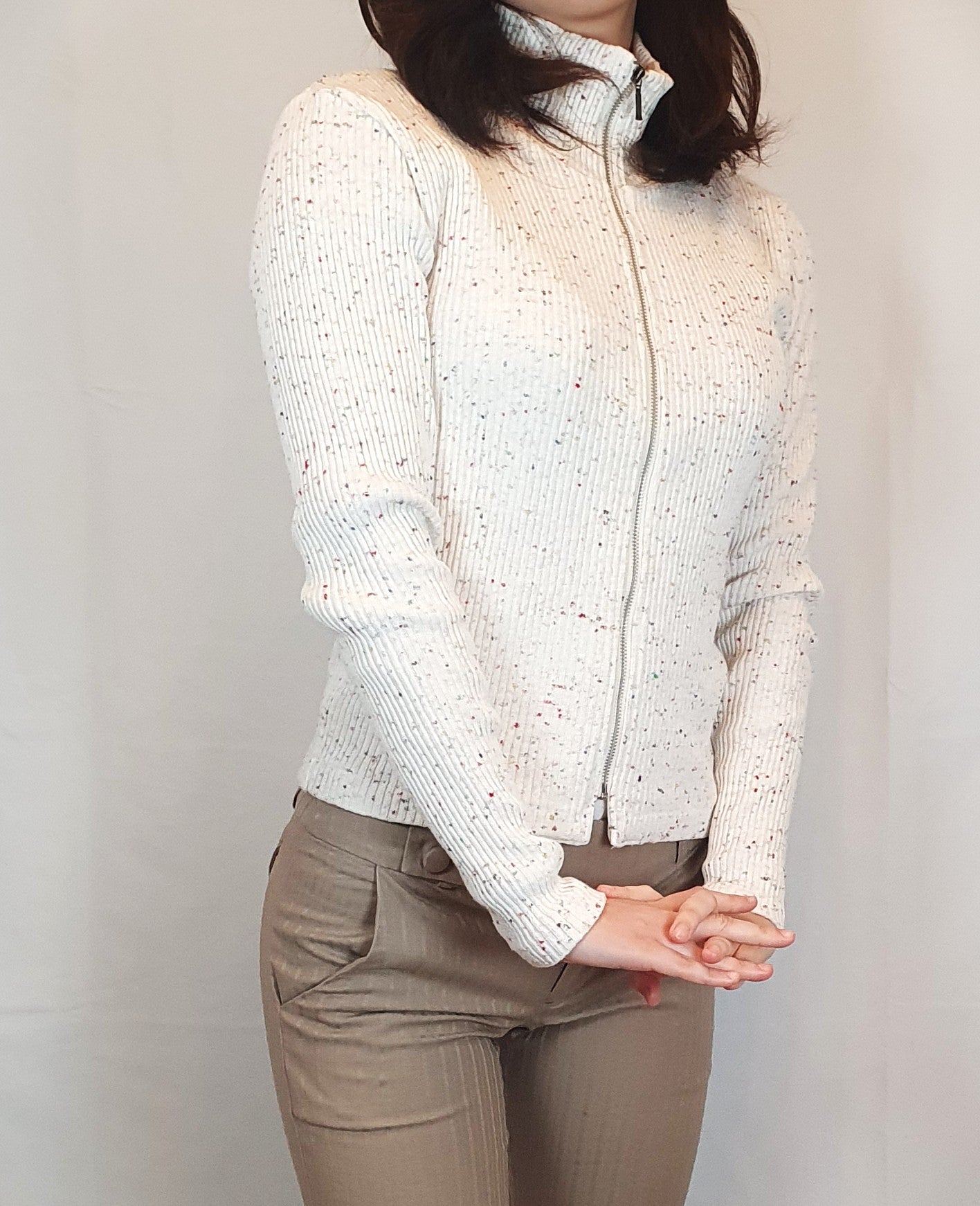 Authentic 90s Japanese vintage knit from the boutique label Teddy Green by O.A.K.S. (Mfr. Code D-TK1517). Features a beautiful cream base with multi-color "nepp" speckles and a sturdy full-zip stand collar.